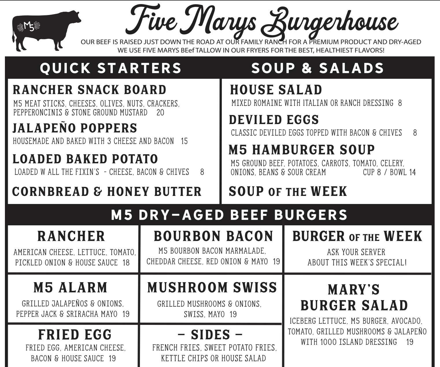 FIVE MARYS BURGERHOUSE IS OPEN FOR LUNCH & DINNER 5 days a week!
